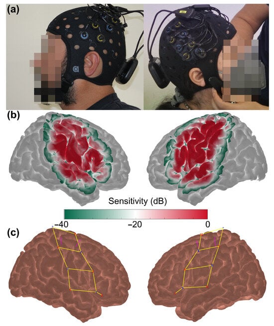 (a) Images displaying the fNIRS probe placed on the head of the participants. (b) A logarithmic plot that represents the sensitivity of the optodes array to detect hemodynamic changes and (c) registered probe geometry covering the motor cortices: channels are indicated by yellow lines, the eight detectors are depicted in blue numbers while the 10 sources are indicated by red numbers; magenta lines delimit the activation area of fingertapping.