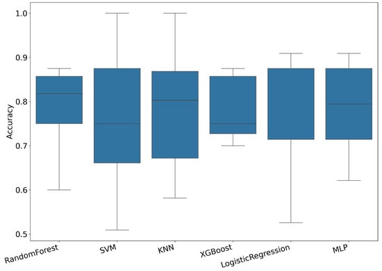 The performance of six machine learning models (Random Forest, Support Vector Machine (SVM), K-Nearest Neighbors (KNNs), XGBoost, Logistic Regression, and Multi-Layer Perceptron (MLP)) was evaluated to classify postCOVID-19 patients. Each model underwent rigorous evaluation through stratified subject-aware cross-validation with a CV5, ensuring that data from each participant were included exclusively in either the training or test folds. Figure 2 shows the distribution across folds for each model. While performance varies across classifiers and participants, most models achieved median accuracies above 75%, demonstrating the overall viability of the hybrid feature approach when generalizing to unseen subjects.