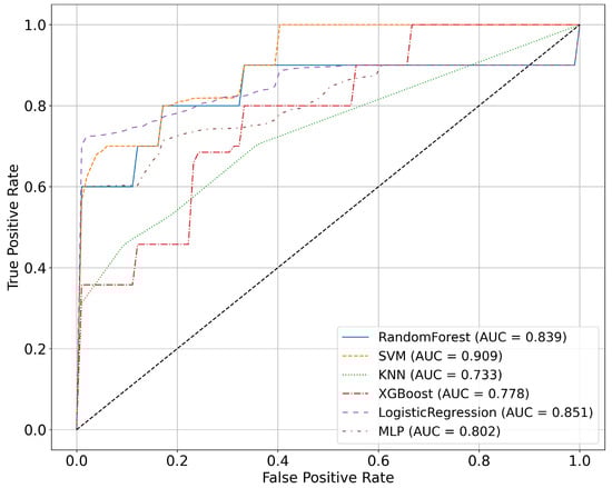 Figure 3 displays the average ROC curves for each of the evaluated machine learning models using the hybrid features and subject-aware cross-validation. The SVM model achieved the highest (0.909), reflecting a stronger overall discriminative capability, followed by Logistic Regression (0.851) and Random Forest (0.839). These ROC curves further support the robustness and clinical potential of the hybrid approach when classifying postCOVID-19 patients based on fNIRS-derived hemodynamic signals.