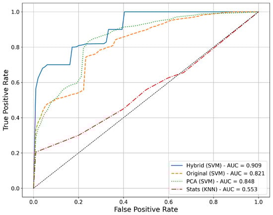 Further comparison of discriminative performance among the best models from each feature representation strategy is depicted in Figure 5. The hybrid feature representation (SVM) outperformed all other approaches, achieving the highest (0.909). The original time-series and PCA-based approaches showed intermediate performance, with values of approximately 0.821 and 0.848, respectively. The statistical feature representation (KNN) demonstrated the lowest discriminative capability ( = 0.553), emphasizing the limited utility of purely statistical descriptors in this context.