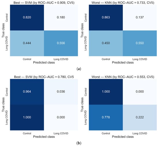 To further illustrate the differences in classification performance between feature representation approaches, normalized confusion matrices for the best and worst performing models using hybrid and statistical features were generated (Figure 7). The hybrid approach yielded balanced performance (Figure 7a), with the best model being SVM ( = 0.909), yielding an approximately 0.556 true positive rate for postCOVID and a 0.820 true negative rate for controls; the worst was KNN ( = 0.733), with approximately 0.550 and 0.863, respectively. In the statistical feature representation (Figure 7b), the best model by was SVM (0.780), which at the default threshold showed near-zero for postCOVID (0.000) despite high for controls (0.964); the worst was KNN ( = 0.553), with a postCOVID of approximately 0.222. These results visualize why hybrid features provide more clinically meaningful balance, whereas purely statistical descriptors tend to collapse .