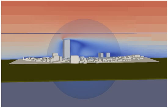 The geometry for the CFD model is created based on the CAD files provided by the AIJ Database (Available at https://www.aij.or.jp/jpn/publish/cfdguide/index_e.htm; accessed on 20 October 2025). A box-shaped computational domain with dimensions 1600 m × 1000 m × 360 m was used. A west wind direction was chosen for this study as it is among the predominant ones, as shown by AIJ []. The inlet boundary is defined as a velocity inlet with profiles for velocity and the turbulent properties taken as described by AIJ []. A zero-pressure Dirichlet boundary condition is assigned to the outlet, while the top and side walls are modeled with symmetry boundary conditions. The building walls and the ground are represented by a no-slip wall boundary condition with a sand-grain height of 0.72 m prescribed to the ground. A single wind direction and velocity using the experimental wind velocity profile have been used for this study.