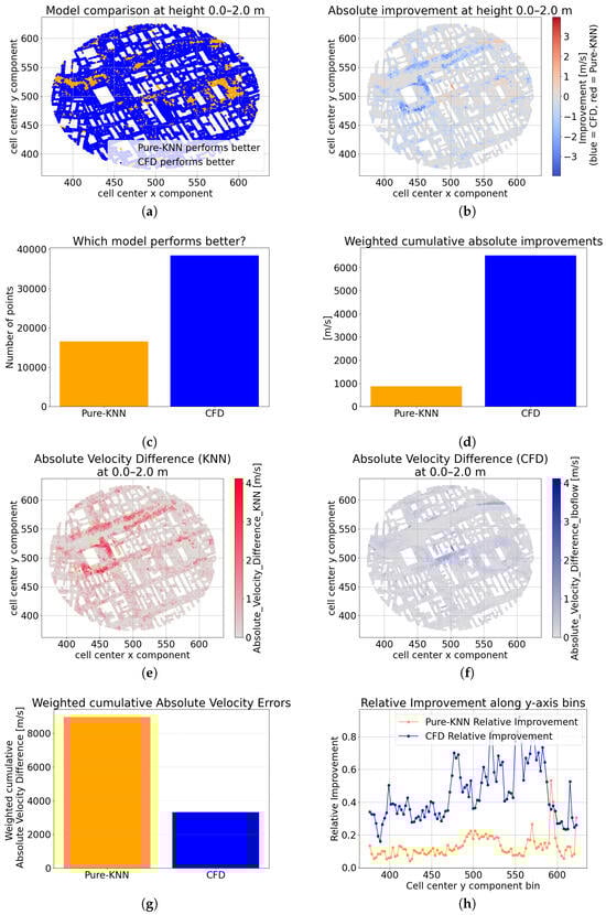 Performance comparison between Pure-KNN and CFD models at height 0.0–2.0 m. (a) Model comparison showing regions of better performance; (b) absolute improvement in velocity prediction; (c) model performance in contrast; (d) weighted cumulative absolute improvements; (e) absolute velocity difference for Pure-KNN; (f) absolute velocity difference for CFD; (g) weighted cumulative absolute velocity errors; (h) relative improvement along y-axis bins.
