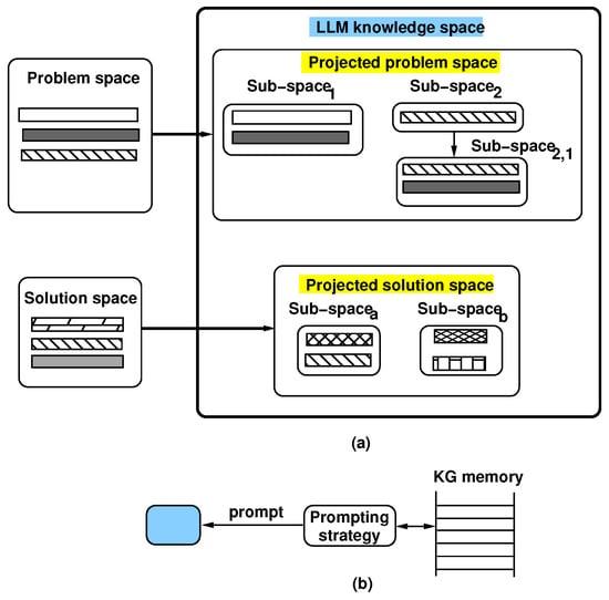 (a) Projection of the problem space and solution space onto the LLM knowledge space and (b) implementation of repeated prompting.