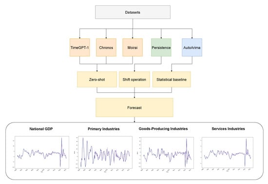 We design an experimental back-testing pipeline, shown in Figure 2. It compares shift operation persistence and statistical baseline ARIMA models against zero-shot forecasts from TSFMs: TimeGPT-1, Chronos-T5 (small, base, large), and Moirai (small, base, large). We generate one-quarter-ahead forecasts for each model over an expanding training window from 1999Q3 to 2024Q3. The forecasts are produced without any additional fine-tuning; the models were pre-trained before being evaluated on the same error metrics (MAE, RMSE, SMAPE, and MASE). To capture the heterogeneous dynamics of New Zealand’s economy, we apply this experiment to four broad production sectors: National GDP, Primary Industries, Goods-Producing Industries, and Service Industries. The selection of these models for the experiments also reveals which classical and TSFMs are strongest with scarce data.