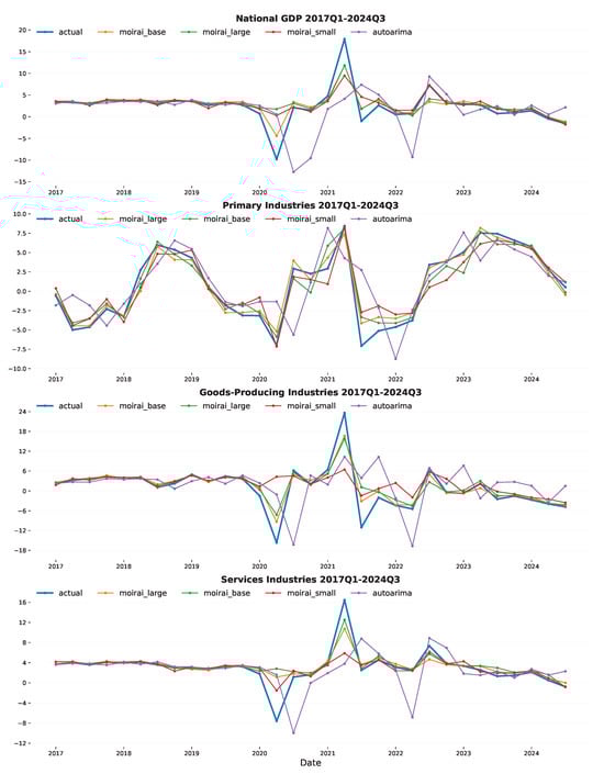 Figure A1 shows the quarterly annual percentage change in the forecasting accuracy of other models for National GDP, Primary Industries, Goods-Producing Industries, and Service Industries over the period 2017Q1–2024Q3.