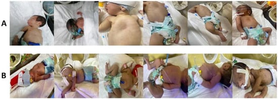 As the dataset is distributed in a lossy JPEG format, compression artefacts, such as 8 × 8 blocking, ringing, blurring, mosquito noise, and colour degradation, are expected. These artefacts were not corrected for in this study. Sample images are shown in Figure 1. Figure 1A displays “normal” neonates (with no apparent yellowing of skin or eyes), while Figure 1B shows “jaundiced” neonates, identified by hospital staff based on visual yellowing. Although the dataset and associated publications do not specify whether diagnoses were confirmed using TSB, TcB, or other clinical measures, given that the data were collected in a NICU by medical personnel, we assume the labels are clinically valid.