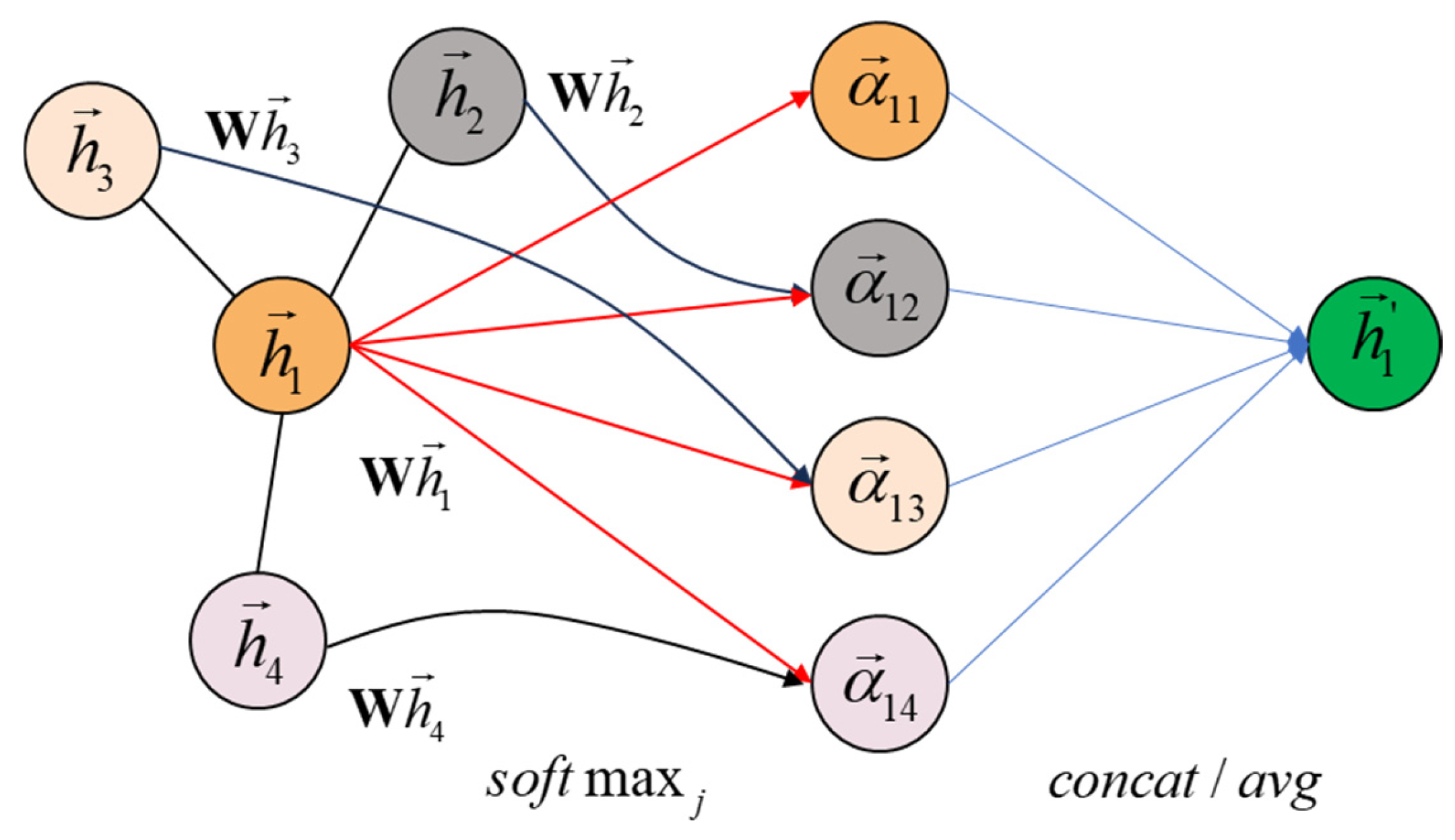 are obtained by weighted aggregation of neighbor information. To enhance robustness, GATs often employ multi-head attention: