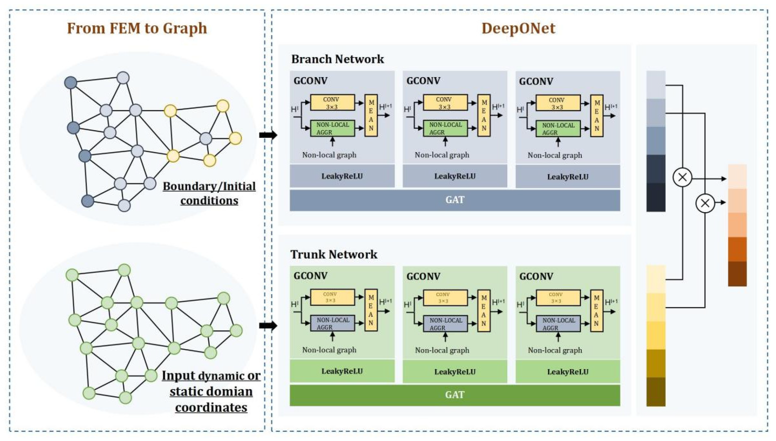 In the original DeepONets framework, the architectural design of the branch and trunk networks is typically open-ended, with no strict constraints on their specific implementations. Therefore, this study embeds a graph attention neural network as the core subnet within DeepONets. The branch and trunk networks map the discrete representations of solution functions and initial/boundary conditions, respectively, into a shared latent variable space of graph structures. The implementation details are as follows:
