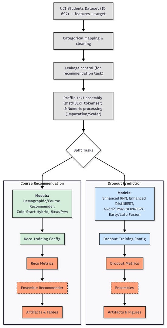 A unified pipeline that serves two advising tasks at matriculation time was implemented. The first is an early-warning dropout classifier that estimates whether a student will Dropout or Graduate. The second is a cold-start course recommender that ranks degree programmes for incoming students who have no interaction history. Both tasks are built from the same admission-time signals; the dropout pipeline additionally allows first-year curricular aggregates when the goal is to simulate early-term screening. The implementation is written in Python/TensorFlow with HuggingFace Transformers and follows a common pattern: deterministic preprocessing, careful separation of pre versus post-enrolment variables to avoid leakage, stratified train–test splits, and evaluation with task-appropriate metrics. The implementation pipeline is shown in Figure 1.