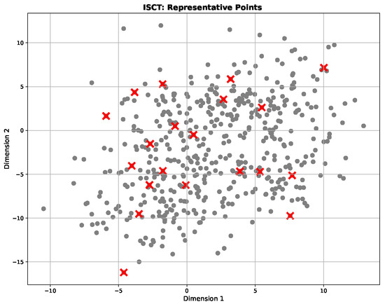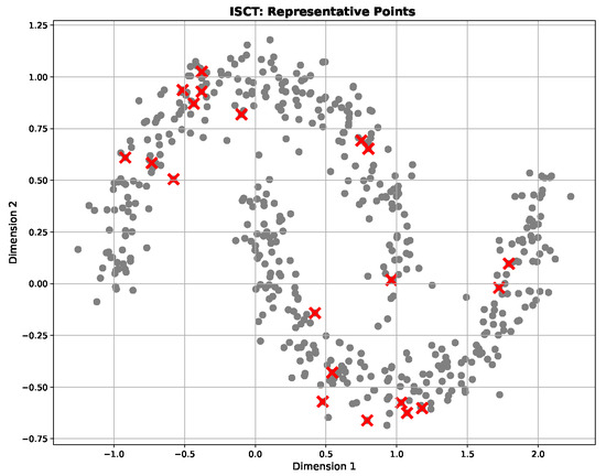 - Data Reduction via Cover tree-Based Summarization: We exploit the hierarchical structure of the Cover tree to select a small set of m representative points (where ) that preserve the essential geometric and density structure of the original dataset. This step drastically reduces the size of the problem.