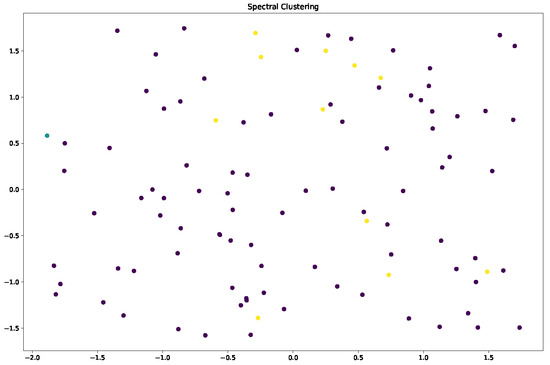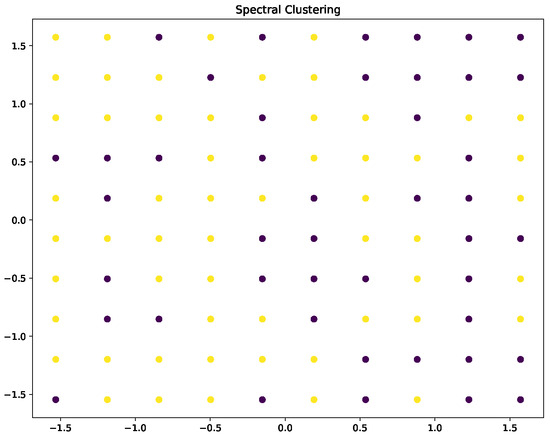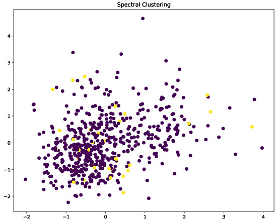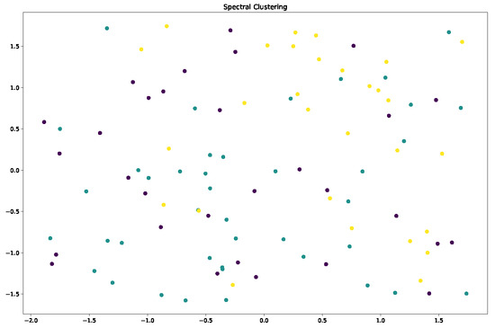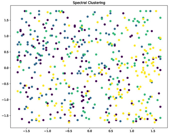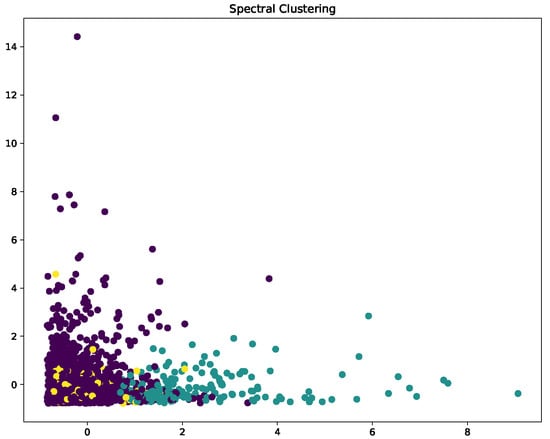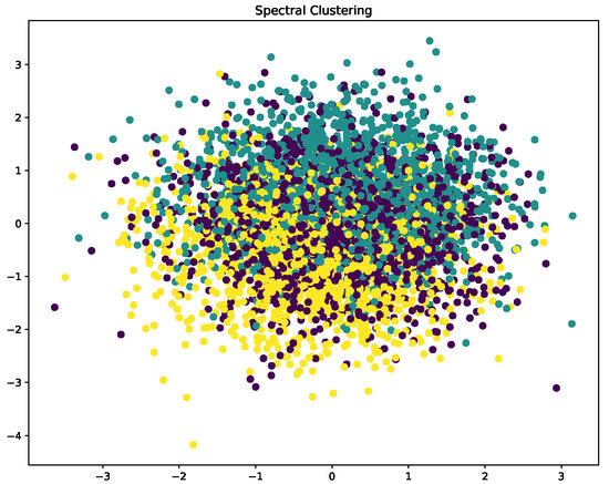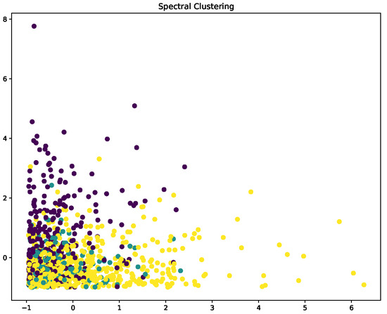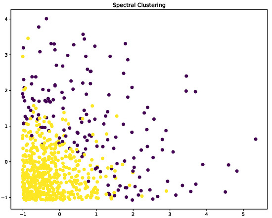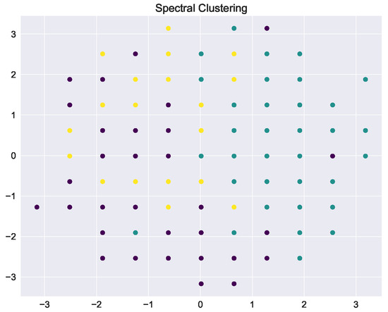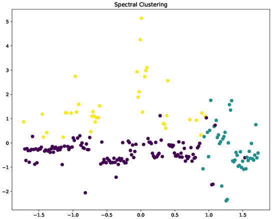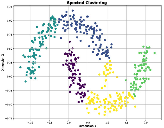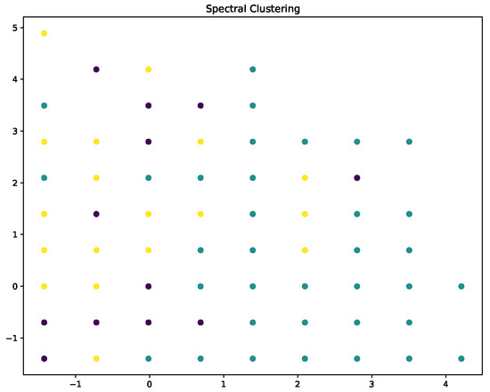 Spectral clustering is a sophisticated and widely-used technique in the field of machine learning and data analysis for partitioning data into clusters based on the eigenvalues (spectrum) of a similarity matrix derived from the data [19]. Unlike traditional clustering methods such as K-Means, which rely on distance metrics to form clusters, spectral clustering leverages the connectivity structure of the data [20]. The process begins with the construction of a similarity graph , where nodes represent data points and edges represent the similarity between pairs of points. This graph is then transformed into a Laplacian matrix, whose eigenvectors are used to map the data points into a lower-dimensional space.