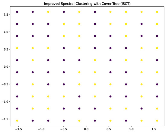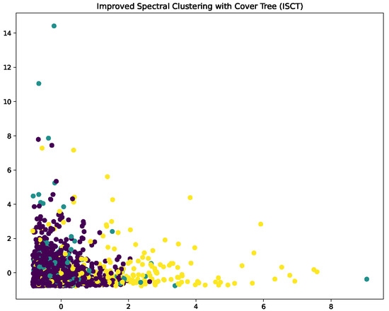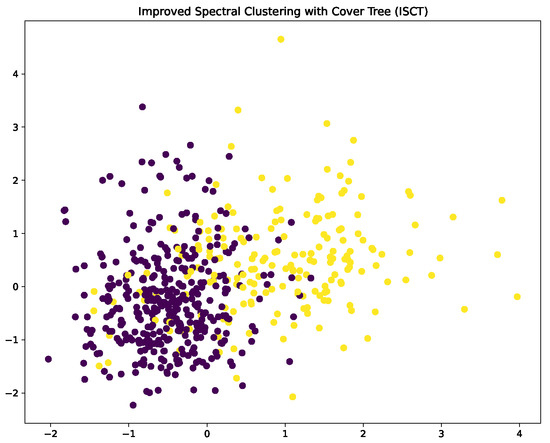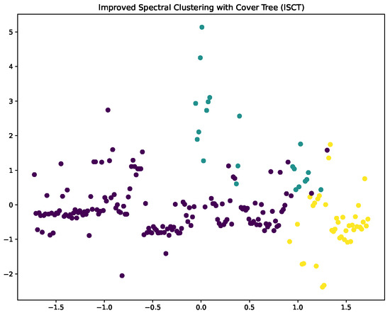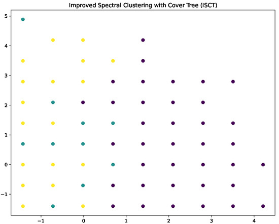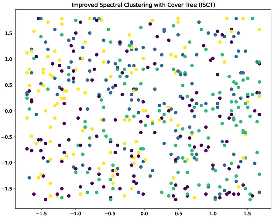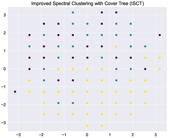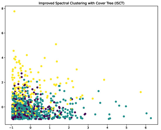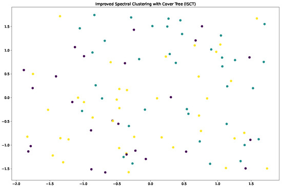 - Approximation and AccuracyThe use of representative points in Cover tree can lead to a loss of precision in clustering results. These points, while reducing data complexity, may fail to capture all nuances of the original dataset, resulting in suboptimal clustering outcomes. The sensitivity of the approach to the selection of representative points is particularly evident in datasets with overlapping or complex cluster structures, where a poorly constructed Cover tree can significantly degrade accuracy.Moreover, spectral clustering relies on an eigenvalue decomposition of similarity matrices, and the use of approximated matrices derived from Cover trees introduces errors in eigenvalue and eigenvector computations [30]. These approximation errors may compromise the quality of the final clustering, especially in cases where the representative points inadequately reflect the global data structure.