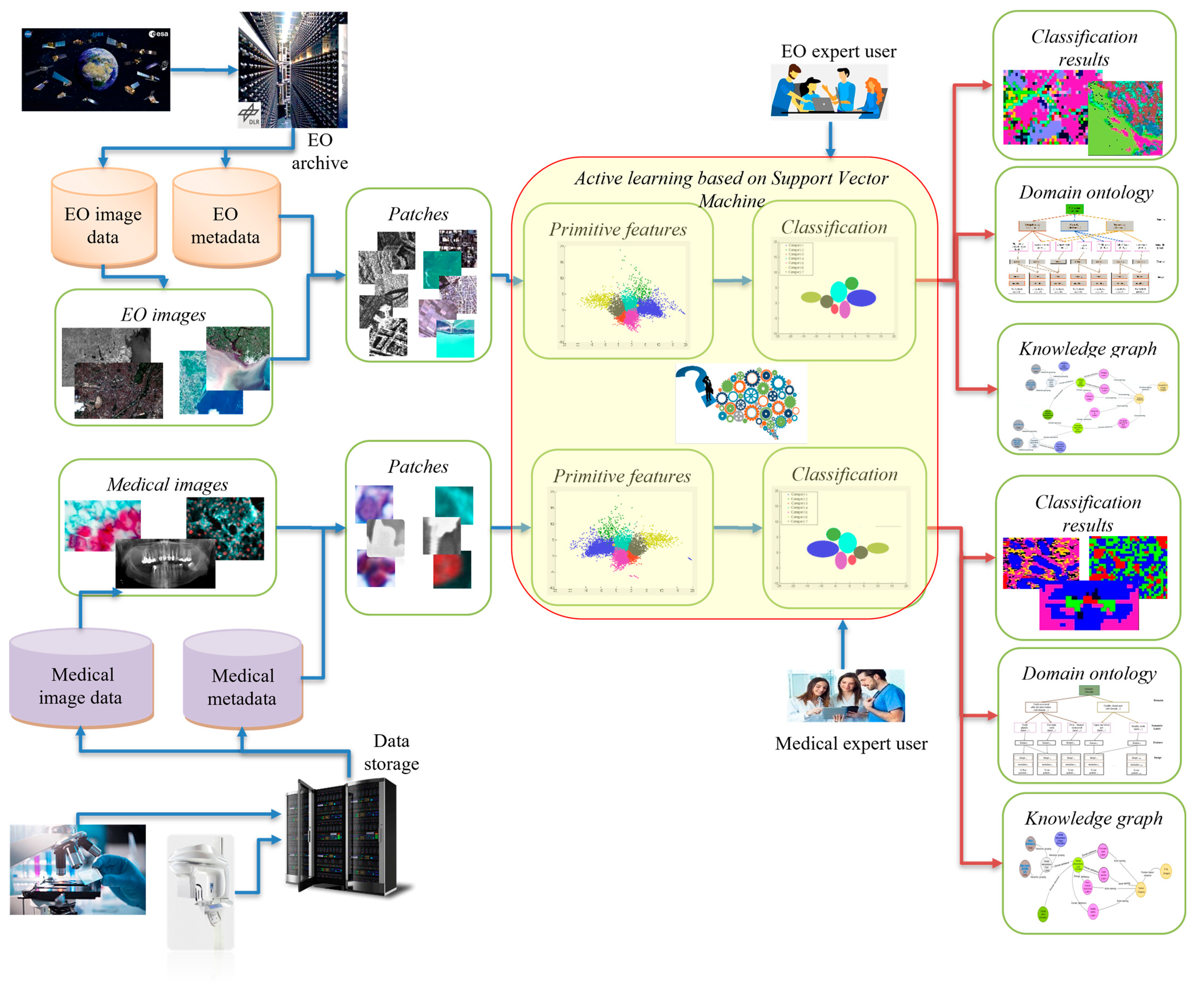 - Step 4: The classification of the primitive features of each original patch is made automatically, and the patch features are grouped into clusters (i.e., “mathematical groupings”) using a Support Vector Machine (SVM) [16] with relevant feedback. The aim is to obtain a feature-based image patch classification by assigning a single semantic label to each patch using a user-oriented terminology of real-world classes. For the SVM, a chi-squared kernel is selected, and a one-against-all approach is used. The activities of the expert users are called “active learning”, referring to the interactive selection of randomly selected positive and negative examples of target classes based on a proper visualisation of the individual patches, a visual comparison of the selected patches (using for comparison the Google Earth maps in the case of EO images and reference health datasets in the case of medical case), and human expert judgements about the actual patch content.