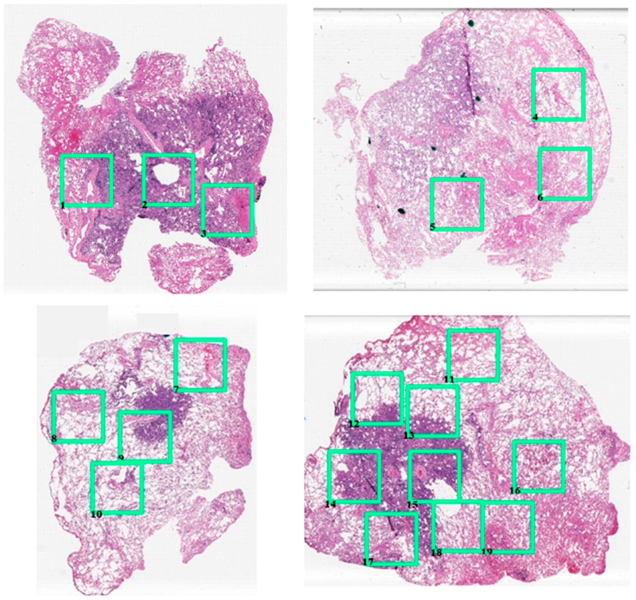 | Lung adenocarcinoma | Optical microscopy | 3/3 | avg. 9688 × 9832 | 890 × 801 | 4 × 4 | 44,400 |