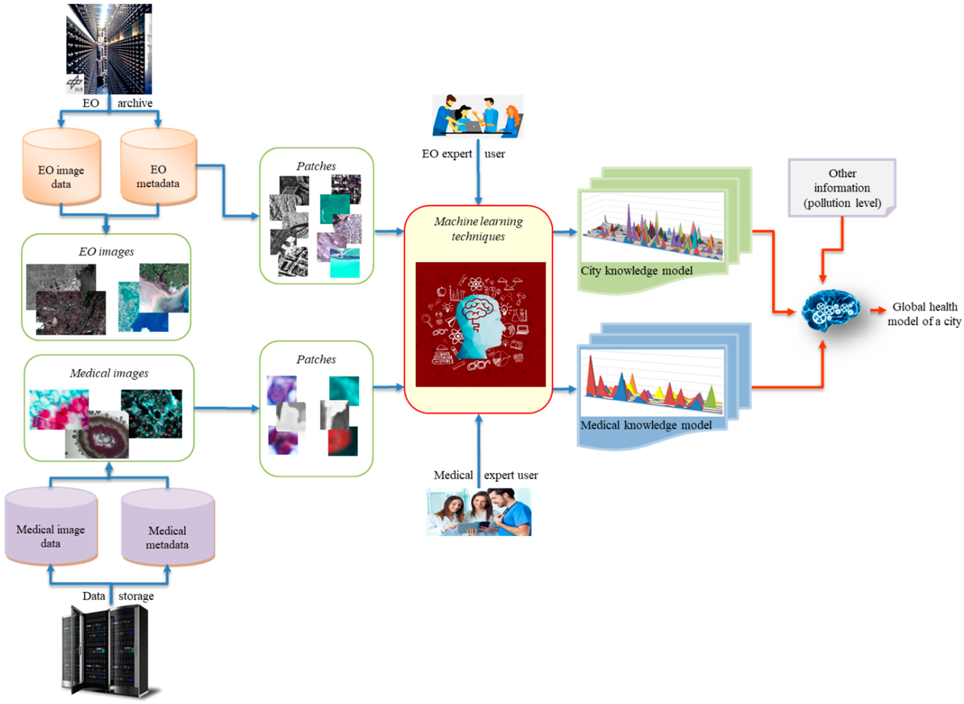 - Step 1: During a preparatory phase, the experts select the dates and target areas acquired by different satellites and download them to typical archives such as the one from the ESA Copernicus hub [17] or the DLR archives [18]. Each EO acquisition from the archive has two parts: the image and the metadata. Later, these two parts are used during operations, as shown in Figure 1. Like EO images, the medical images are acquired by various devices/sensors operated by experts and stored on servers as images and metadata associated with each medical image.