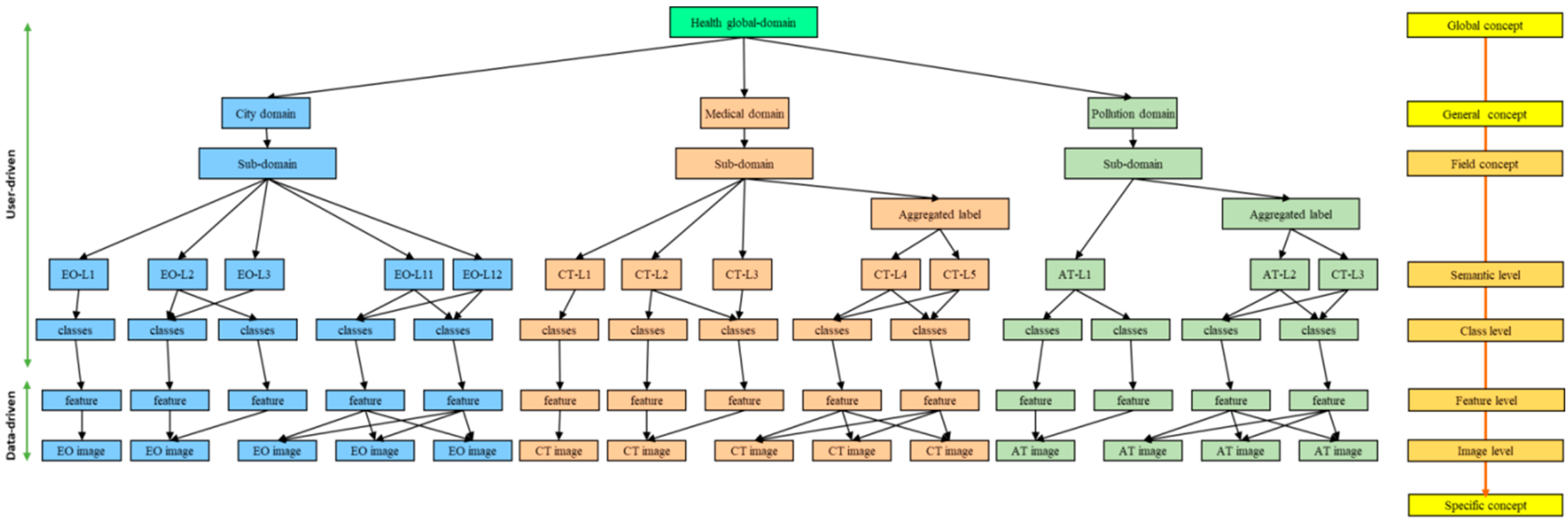 - Step 5: Generate a set of patches that are semantically correctly labelled. This step is finished once all the given patches have been labelled. However, some patches may remain unlabelled. If the missing labelling represents problem cases, an expert user must identify the most probable class, or the data can be assigned to an unclassified class. There is already a hierarchical semantic labelling scheme in the case of EO images (see [16]). However, regarding the medical images, the experience of expert physicians is significant for defining the semantic labels allocated to the classes.
