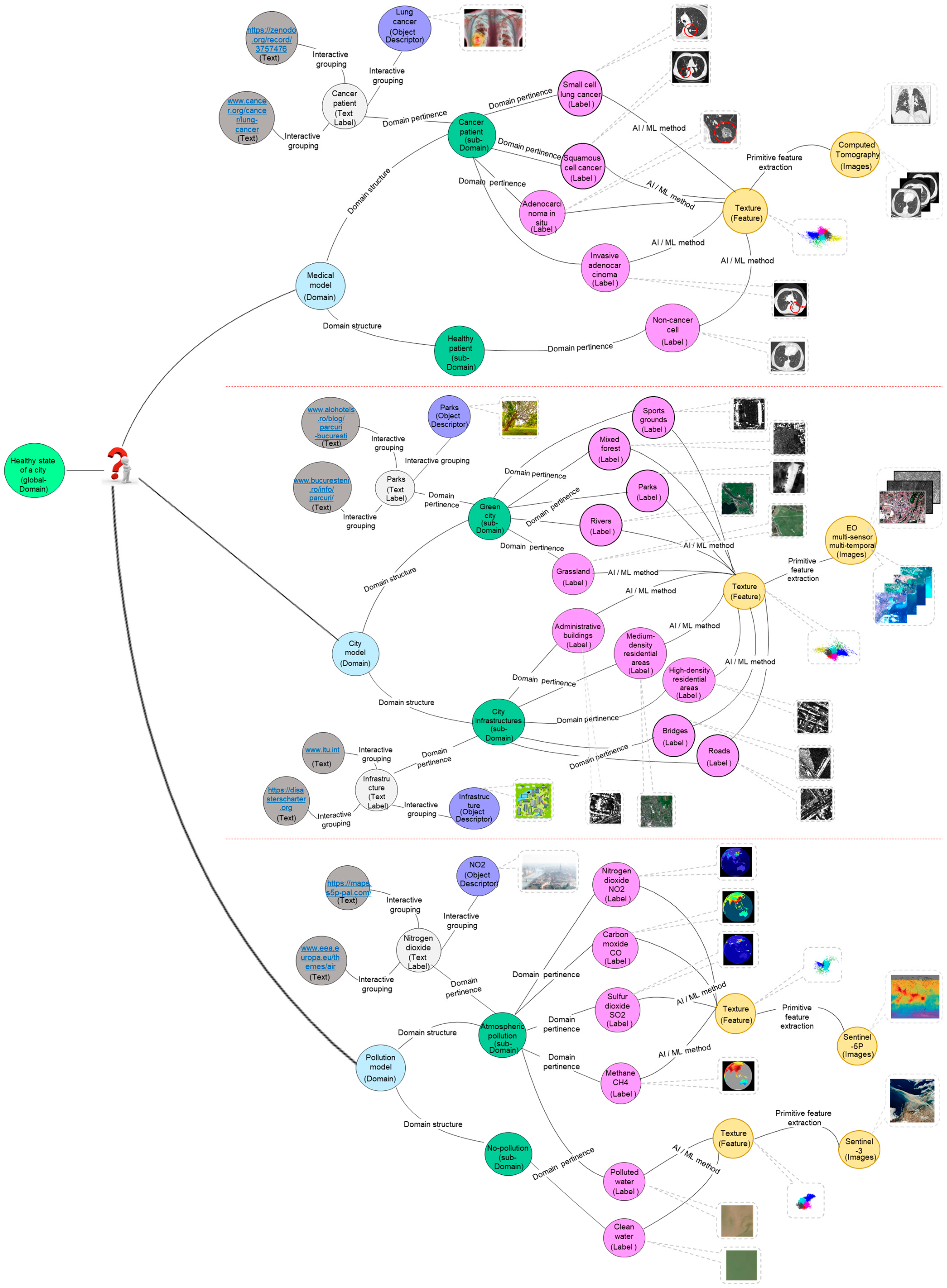 - Step 6: Interpretation of the produced results. The first data product is the semantic classification results/maps of each image—or, in the case of image time series—the corresponding change maps. The second product is domain ontology representations [5], which help users extract the information and knowledge from the images. Finally, knowledge graphs can be created to explain the entire chain of relations (starting from the data, information extraction up to the semantic classes and their relations).