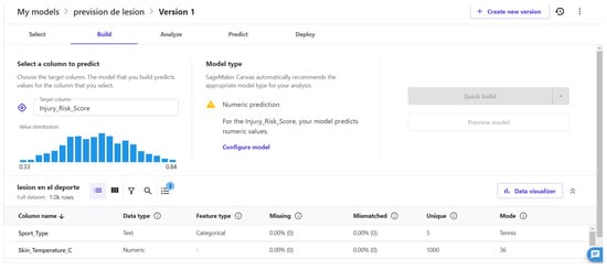 - Dataset Preparation: The injury risk dataset was uploaded to each platform. Initial exploration was conducted using built-in visual tools to examine variable types and distributions and detect any outliers or missing values. The dataset was configured for training by specifying the target variable Injury_Risk_Score and excluding irrelevant columns. No manual preprocessing was required, as all platforms offered automated handling of data formatting and type inference.