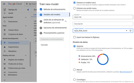 The regression task was configured using the AutoML interface. The target variable Injury_Risk_Score was selected, and the problem type was defined as a regression task. Vertex AI provides an optional weighting column feature, but this was left blank to preserve comparability across platforms. Figure 3 shows the default settings were used throughout, including a random data split (80% training, 10% validation, 10% testing) and Root Mean Squared Logarithmic Error (RMSLE) as the optimization metric.