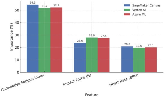 The trained model was evaluated using the platform’s built-in metrics dashboard. Vertex AI reported an RMSE of 0.003, an RMSLE of 0.002, and an R2 score of 1.000. Feature importance was provided using Shapley values, clearly indicating the most influential variables as described in Figure 4: Cumulative_Fatigue_Index (51.69%), Impact_Force_Newtons (27.96%), and Heart_Rate_BPM (19.59%). The results were presented through intuitive visualizations, facilitating interpretation without the need for technical explanation.