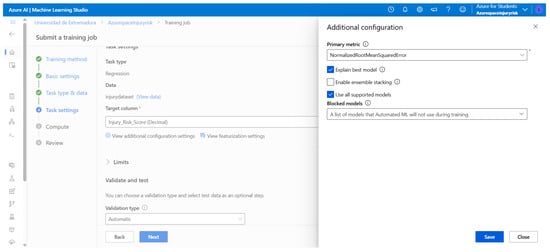 Using the Auto Pilot feature, the task was set up as a numerical prediction problem with Injury_Risk_Score as the target variable, as recommended by the tool itself, as shown in Figure 2. The platform automatically selected appropriate preprocessing steps and ML algorithms. The default optimization metric, Mean Squared Error (MSE), was applied without user adjustment. The process was fully guided and required no manual parameter tuning.