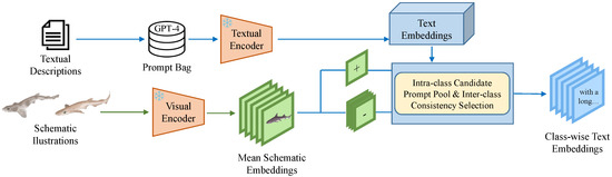 - First, the prompt selection stage (Section 3.1) involves generating expert and category-specific textual descriptions from schematic illustrations that capture the distinctive morphological traits of each class. These descriptions are evaluated by measuring the similarity between their embeddings and those derived from the illustrations, selecting the prompts that best represent each class while minimizing confusion with others.For example, for the species Galeus melastomus, the prompt “a shark with reddish-brown coloration and oval spots encircled in white” was selected, as it showed the highest correspondence with its schematic illustration and minimal confusion with other species of the same order. The circular white-bordered spots and characteristic coloration reinforce its distinctiveness.