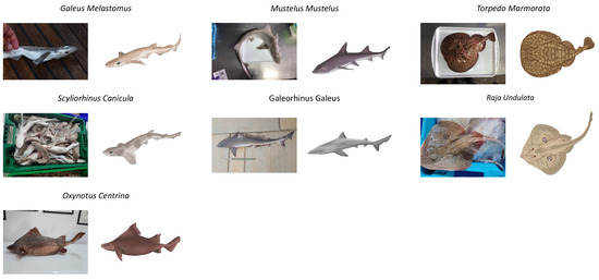 The dataset used in this study consists of images of elasmobranchs observed in the southeastern Mediterranean region (Levant), captured out of the water. The represented species are taxonomically distributed into two main groups (sharks and rays), four orders, five families, and seven distinct species. In total, the dataset includes 448 real images collected from heterogeneous sources, which were preprocessed to maintain a square format and padded with white in the uncovered areas. The data distribution is shown in Table 1. In addition, three schematic illustrations per species were incorporated, selected by experts, centered, segmented on a uniform white background, and manually refined, as shown in Figure 3. This is an evolving dataset, designed with the aim of progressively incorporating new species and expanding the visual representation of each existing category.
