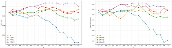 Balanced accuracy (left) and accuracy (right) results with different configurations of as a bias multiplier and modified layers in the CLIP architecture.