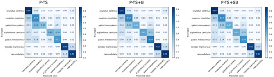 The metric was computed using the macro average to balance the contribution of each class regardless of its frequency within the dataset. The obtained values, (0.73) and (0.75) for the attention-biased variants, respectively, confirm that both outperform the purely sequential P-TS version. This demonstrates that the incorporation of attention not only enhances overall differentiation but also improves recognition among species with subtle visual similarities, providing a consistent advantage to the taxonomy-aware approach.