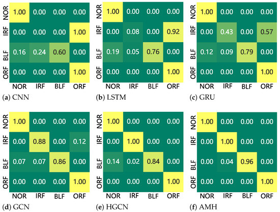The confusion matrices of all models provide further insight into their classification behaviors and misclassifications tendencies. As shown in Figure 3a, CNN exhibits substantial confusion between inner race faults and the ball category. Many IRF and BLF samples are incorrectly classified as ORF, whereas NOR and ORF classes are recognized reliably. This outcome indicates that CNN primarily captures prominent global patterns but fails to separate fine-grained inner race fault variations, leading to high false negatives in these categories. As illustrated in Figure 3b, LSTM alleviates this issue by incorporating temporal dependencies, but it still misclassified a portion of IRF instances as ORF and confuses BLF with both NOR and ORF, reflecting a limited capacity to distinguish subtle variations in fault severity. The GRU model (Figure 3c) improves recall for BLF compared with LSTM; however, similar confusion persists, with IRF samples frequently misidentified as ORF, demonstrating that gating mechanisms alone are insufficient to achieve robust separation. Graph-based methods significantly reduce these ambiguities by leveraging structural information. GCN (Figure 3d) achieves more balanced recognition across classes, though IRF still exhibits partial confusion with ORF. HGCN (Figure 3e) further enhances class separation, with IRF recognized almost perfectly and only minor misclassifications occurring in BLF, underscoring the advantage of modeling high-order dependencies among samples. The proposed AMH framework (Figure 3f) demonstrates the strongest discriminative capability, achieving nearly perfect separation across all fault categories. NOR and ORF are recognized with complete performance, IRF achieves flawless classification, and BLF is almost entirely separated from the other categories with only negligible confusion. These results confirm that adaptive hyperedge construction and multi-view feature integration effectively exploits complementary fault characteristics and minimize overlap among closely related fault types. Overall, confusion pattern analysis reveals that while conventional models struggle with inner race fault differentiation, AMH establishes clear decision boundaries, thereby reducing misclassifications and achieving superior fault separability.