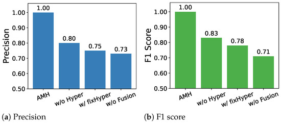 To gain deeper insight into the contribution of each module within the AMH framework, an ablation analysis is performed, which also introduces a variant employing fixed hyperedges to evaluate the impact of the adaptive design. The comparative outcomes, illustrated in Figure 4, report performance for four model variants. The full AMH configuration achieves the best results, with precision and F1-score values approaching 1.00, indicating its superior capability in distinguishing various fault categories. When the adaptive hyperedge construction is removed (w/o Hyper), the performance declines noticeably (precision = 0.80, F1-score = 0.83), emphasizing the importance of modeling high-order correlations beyond pairwise connections. When replacing the adaptive module with fixed hyperedges (w/fixHyper), the performance further decreases (precision = 0.75, F1-score = 0.78), confirming that adaptivity is critical for learning condition-aware and data-driven relationships. The largest performance drop is observed when the multi-view fusion module is excluded (w/o Fusion), where precision decreases to 0.73 and F1-score to 0.71, indicating that combining complementary time, frequency, and time–frequency information is essential for robust and accurate fault classification under varying operating conditions.
