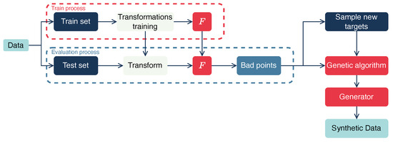 The points we obtain after augmentation with a genetic algorithm are denoted as . These points also include the bad points , but with additional augmented examples. Next, we take these points and train a generative model on them. This generative model produces synthetic data points . The description of the generative model is presented in Section 4.4.