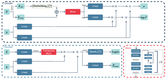 Variational autoencoder pipeline. The encoder and decoder architectures process features with several convolutional and linear layers and use the targets for linear modulation as the conditions. Data tensors are visually represented in teal. Linear projections, non-linear activation functions, and convolution operations are depicted in blue, while block representations of layer combinations such as convolutions, activation functions, and normalizations are shown in red boxes. The symbol × denotes element-wise multiplication, and + denotes element-wise summation. The embedding layer for categorical features is distinguished by a light green and consists of a set of matrices for each category. These matrices are trainable and have dimensions with rows corresponding to the number of unique categories in a categorical feature and columns corresponding to the fixed embedding size. Solid arrows represent the primary data processing, while dashed lines indicate optional processing for categorical data.