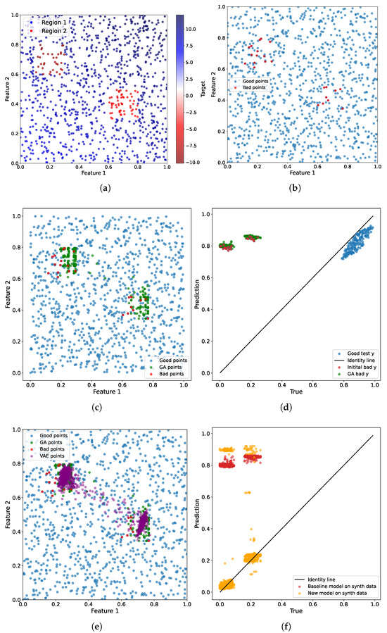 (a) The synthetic dataset. (b) The bad examples were after the baseline regression model was trained. (c) New augmented points after the genetic algorithm was applied. (d) The prediction results on the bad points and GA points. (e) The points generated by the VAE model. (f) The prediction results for the baseline and the new model for comparison on the synthetic dataset.