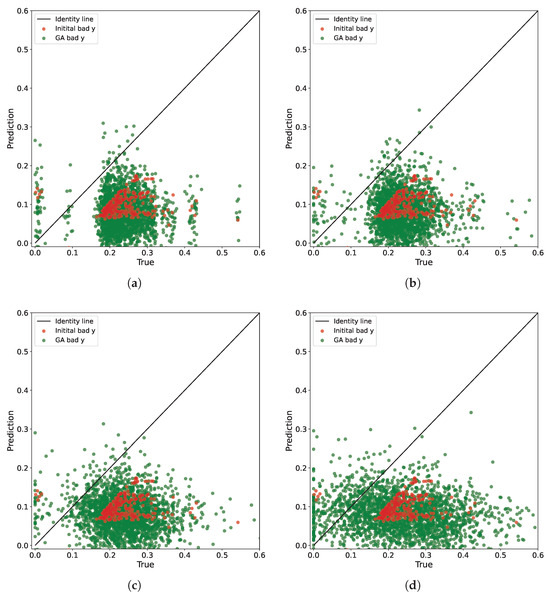 It is noteworthy that the most significant bad points are predominantly located near the boundary of an empty area. While some points are located away from the boundary, this may be attributed to the dimension reduction process (Figure 8a). In Figure 8b, it is evident that the points generated after augmentation using the genetic algorithm completely encompass the empty area. The points generated by the VAE model cover the same area but exhibit a denser distribution. Therefore, it can be inferred that the newly identified bad points are not random fluctuations but rather exhibit a systematic pattern.