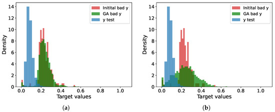 Figure 5 presents histograms illustrating the distributions of the test sample for the cases and . While the histograms are normalized, this may slightly distort the visualization. Notably, the test sample contains bad points, but the majority of the data points are concentrated between and . The regression model exhibits poor performance in the range from to . Green represents the distribution of new points generated by the genetic algorithm. Considering that the initial bad points were perturbed by a random value with , it is evident that the augmented points are distributed beyond the main peak of the bad points, thereby encompassing their broader range.