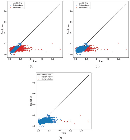 Prediction outcomes of the baseline model for various thresholds on the test set for real-world regression data. The optimal prediction results align with the identity line. Points identified as bad are highlighted in red, while points from the test dataset are highlighted in blue. (a) . (b) . (c) .