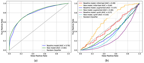 Receiver operating characteristic (ROC) curve. The X-axis represents the false positive rate, which is the proportion of instances where the model incorrectly predicts a label of «1» when the actual label is «0». The Y-axis represents the true positive rate, which is the proportion of actual labels of «1» that are correctly identified by the model. (a) ROC curve for the test sample. (b) ROC curve for the bad, augmented, and synthetic points.