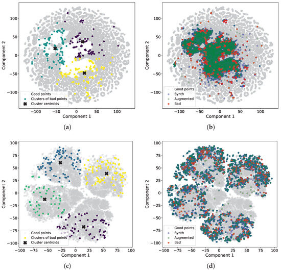 Visualization of t-distributed stochastic neighbor embeddings (t-SNE) components. Gray points represent good data, red points represent bad data, green points represent augmented data, and blue points correspond to synthetic data. (a) t-SNE components for regression problems with clusters of bad points. Clusters are visually distinguished by three distinct colors. (b) t-SNE components for regression problems with bad, augmented, and synthetic points. (c) t-SNE components for classification problems with clusters of bad points. Clusters are visually distinguished by four distinct colors. (d) t-SNE components for classification problems with bad, augmented, and synthetic points.