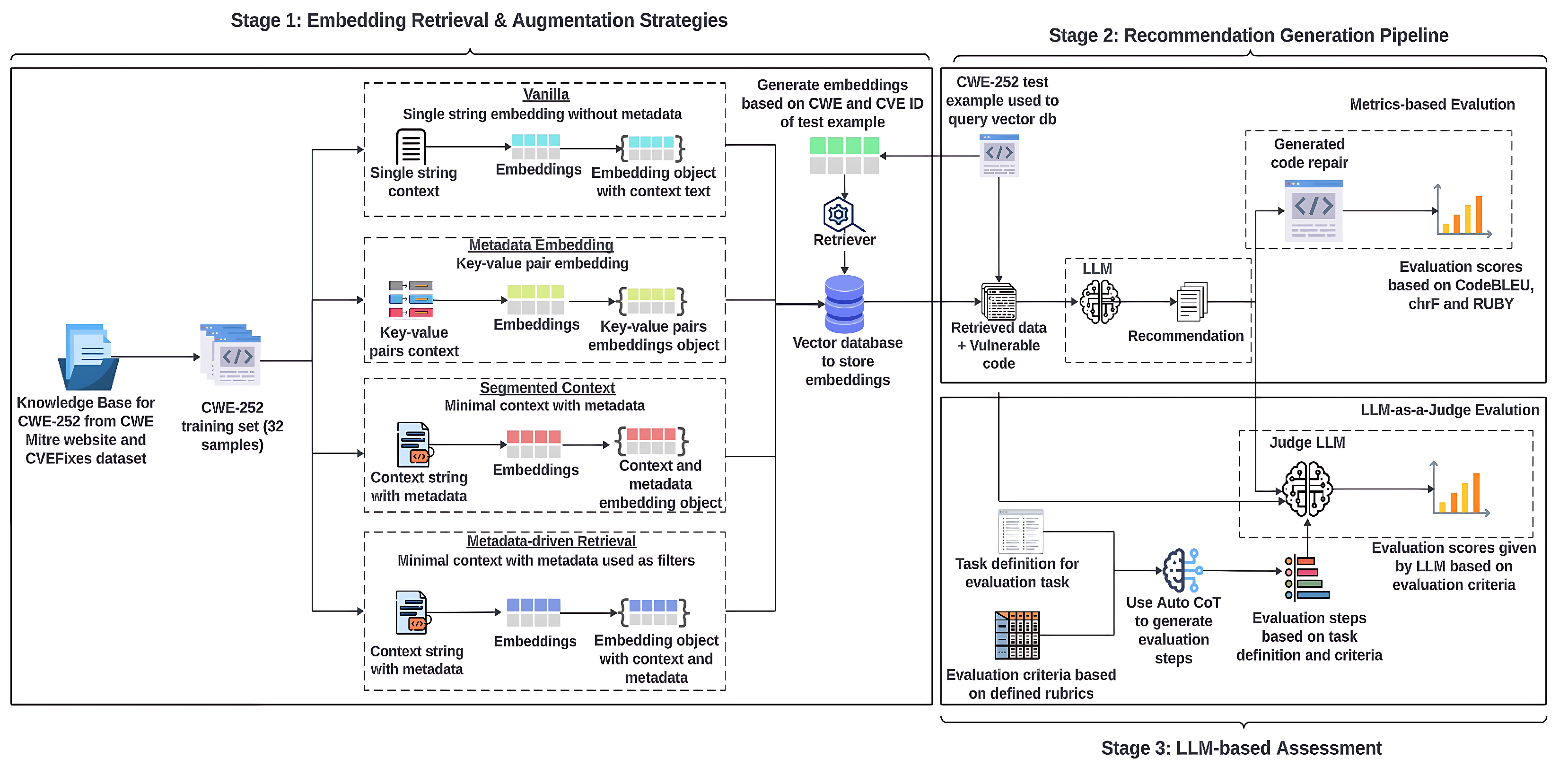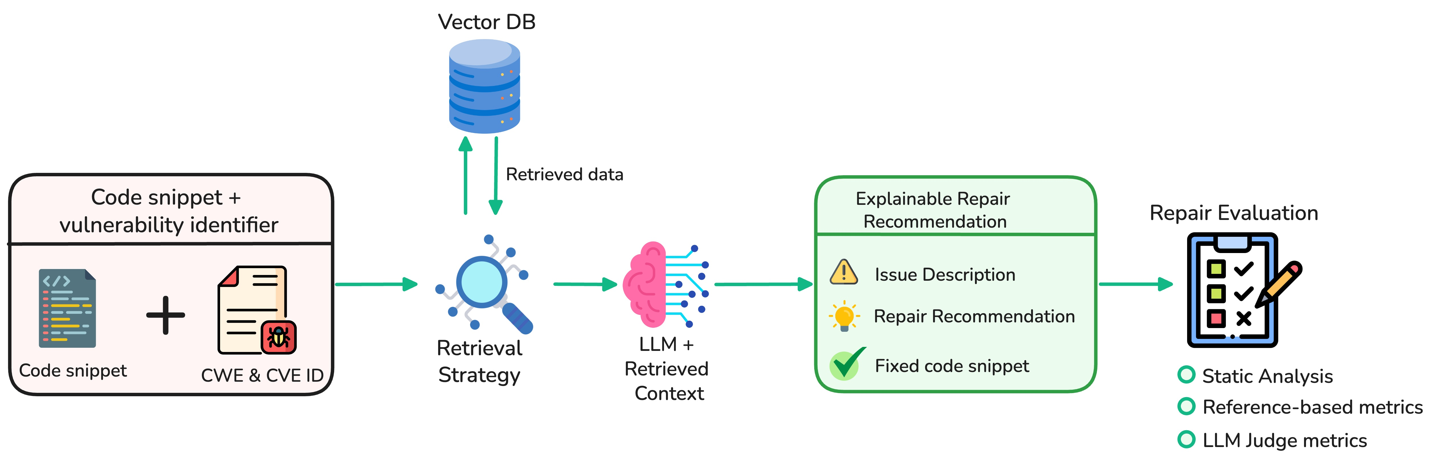 - LLM-based Pipeline for Vulnerability Repair Recommendations: We propose a retrieval and augmentation pipeline that retrieves domain-specific contextual information from an open knowledge base, augments the retrieved context into LLM prompts, and generates actionable recommendations.