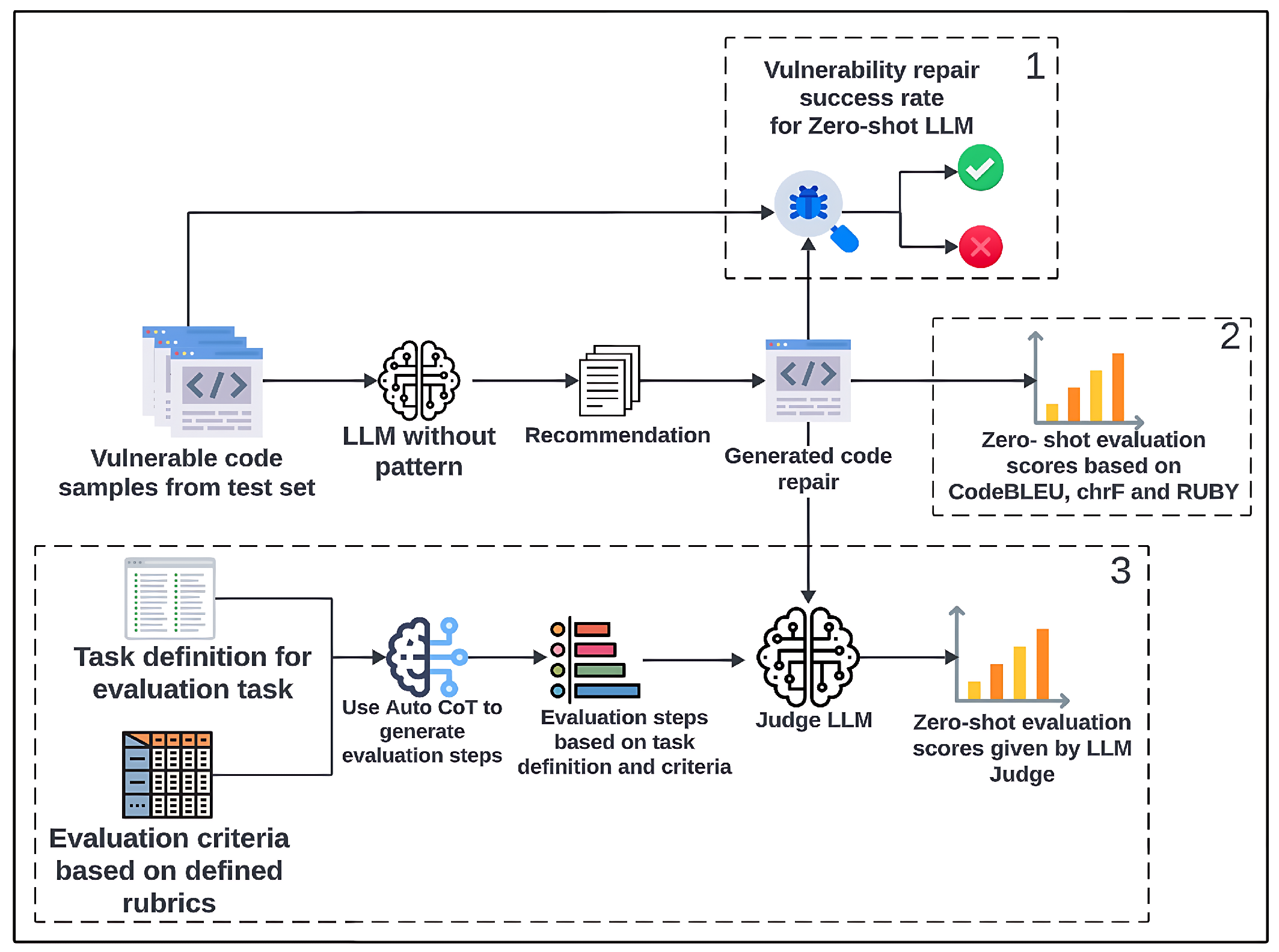 - RQ3: How do different evaluation methods affect the assessment of code-repairing recommendations? We investigate the limitations of using reference-based metrics such as CodeBLEU, chrF, and RUBY to assess code repairs based on the LLM recommendations. We also investigate the ability of an LLM-as-a-Judge to directly evaluate the recommendations to overcome the limitations of the SOTA metrics and provide alignment with the human manual inspection process.