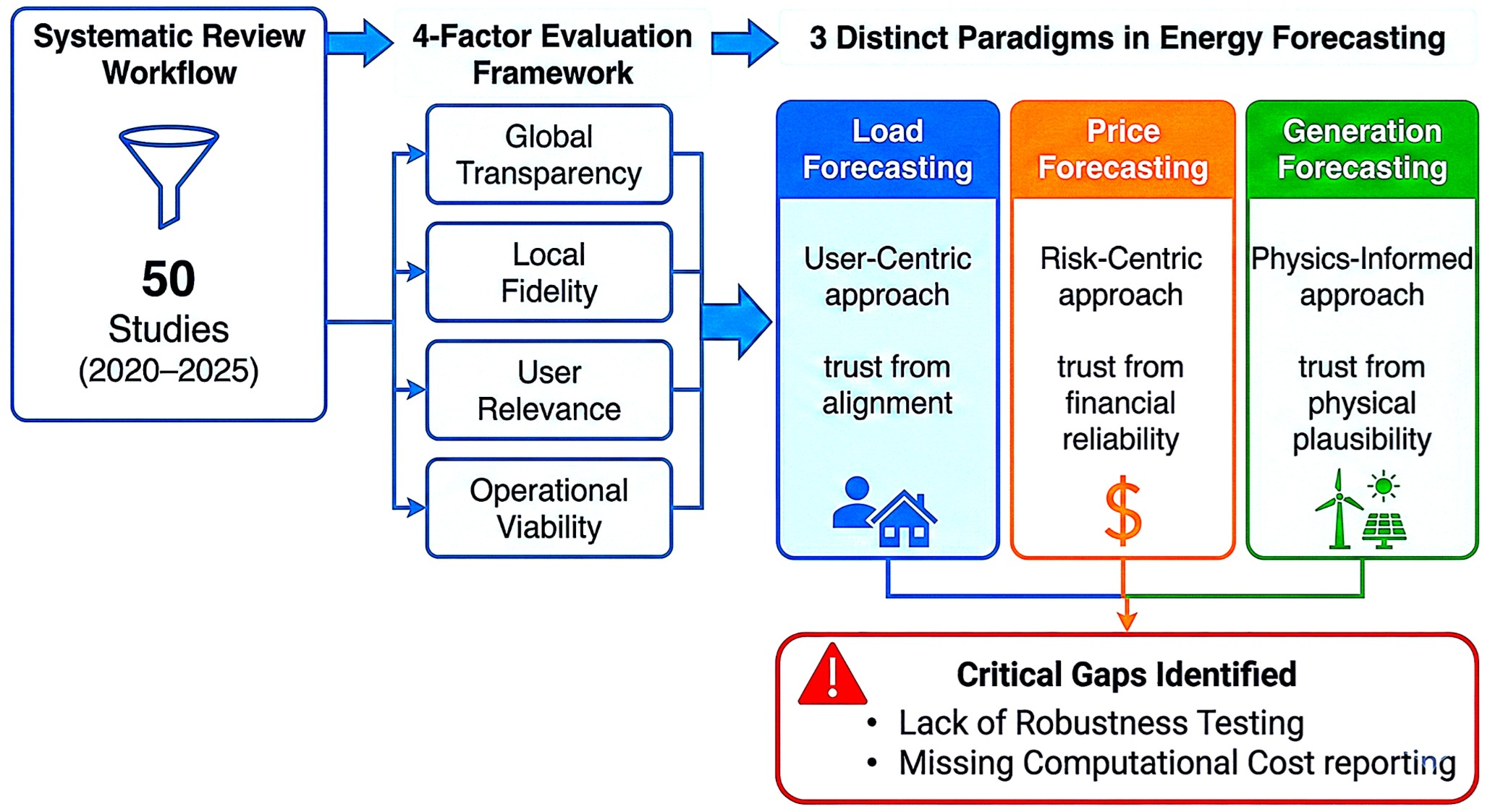 To highlight the novelty and scope of our work, Table 2 compares this review with existing XAI-related surveys in energy and time-series forecasting. It demonstrates that, while prior reviews offer valuable insights, they are often limited in domain coverage, lack a trust-centric focus, or fail to align explanations with user roles. In contrast, this review uniquely integrates forecasting specificity, explanation fidelity analysis, and domain-specific trust constructs across load, price, and generation forecasting, with explicit alignment to operational constraints and user needs.
