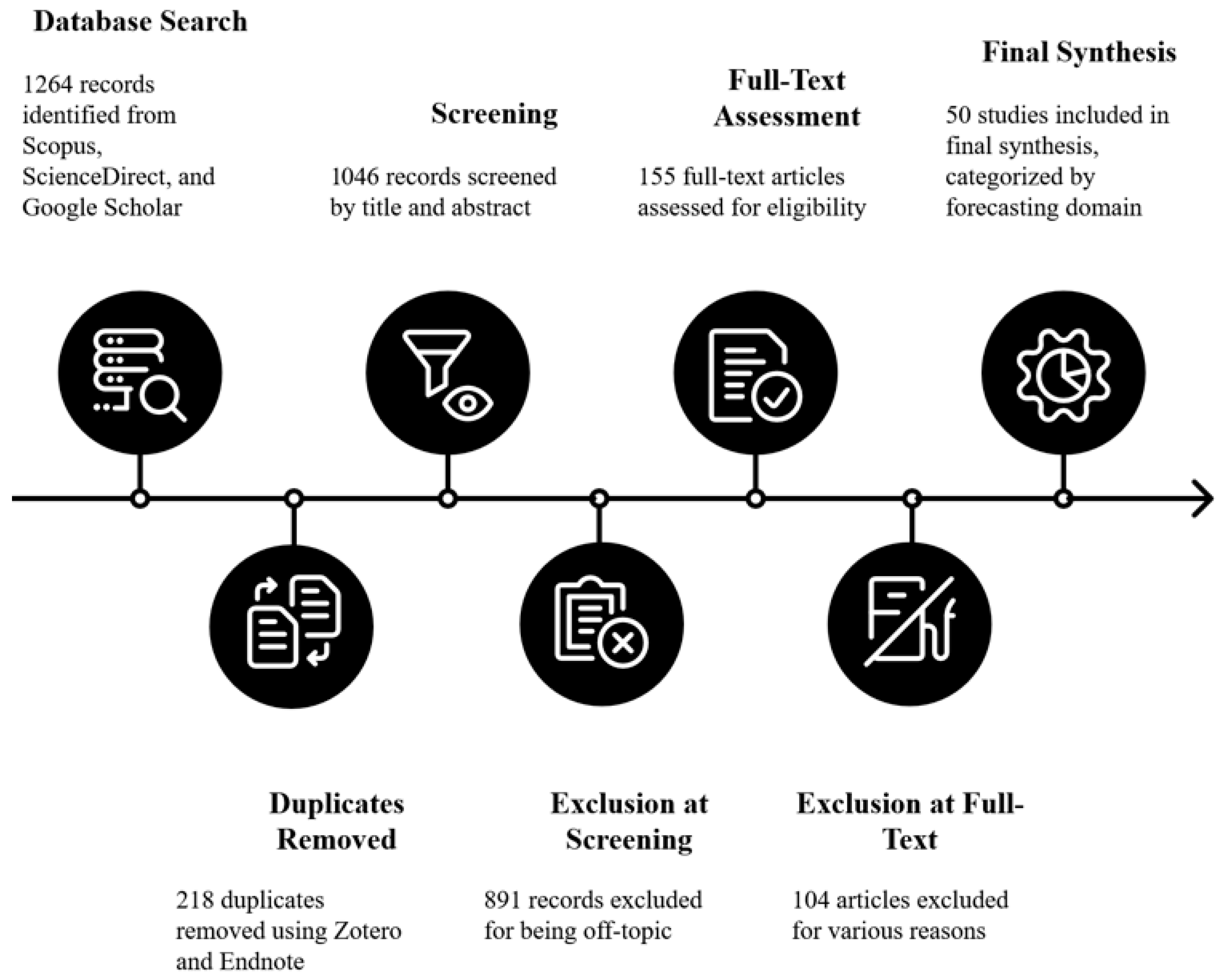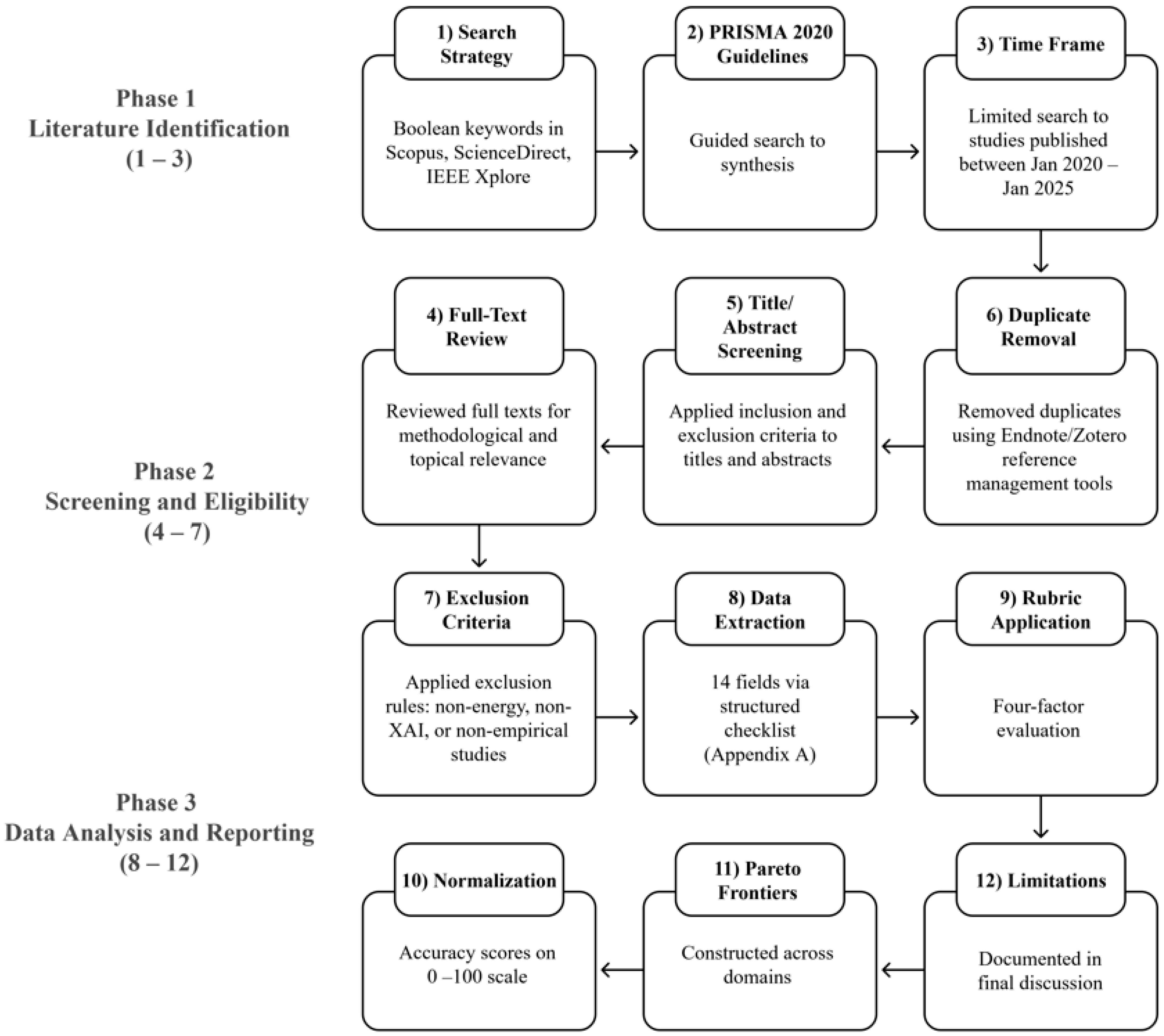 We conducted a PRISMA-inspired systematic review to identify peer-reviewed studies on Explainable Artificial Intelligence (XAI) in energy time-series forecasting, published between January 2020 and June 2025 [23]. Our protocol was adapted from established systematic review guidelines to ensure transparency, reproducibility, and methodological rigor. The process consisted of three phases, as detailed below and visualized in Figure 1 (methodological workflow) and Figure 2 (PRISMA inspired flow diagram).