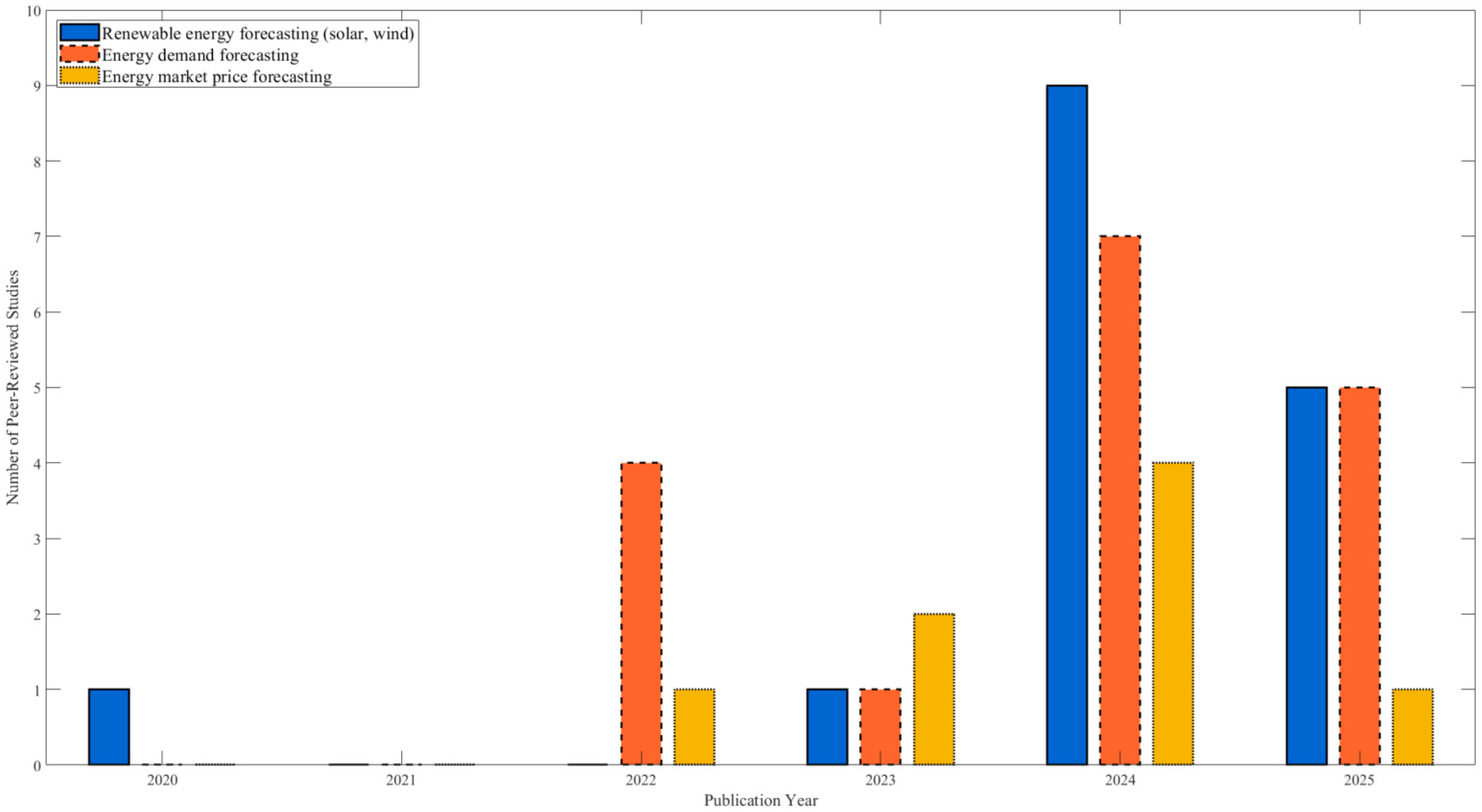 To focus on recent methodological advances, we limited results to studies published between January 2020 and June 2025. This search strategy, guided by the PRISMA 2020 statement [23], ensured broad coverage of peer-reviewed literature while maintaining specificity to energy time-series forecasting applications.