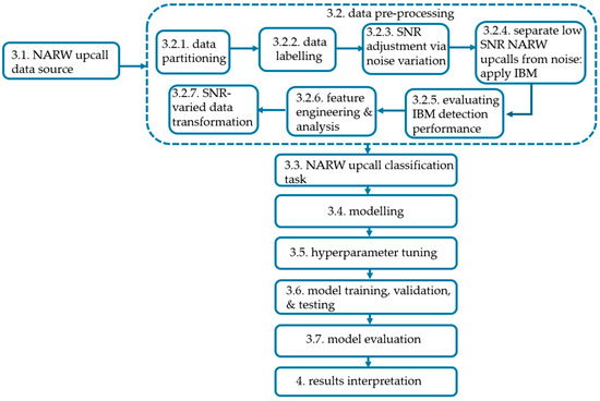 Methodological pipeline including data pre-processing (Section 3.2); NARW upcall classification task (Section 3.3); modeling (Section 3.4); hyperparameter tuning (Section 3.5); model training, validation, and testing (Section 3.6); model evaluation (Section 3.7); and results interpretation (Section 4). The workflow starts in the upper left corner (Section 3.1). The numbers in each box indicate the section of the paper where that topic is discussed.