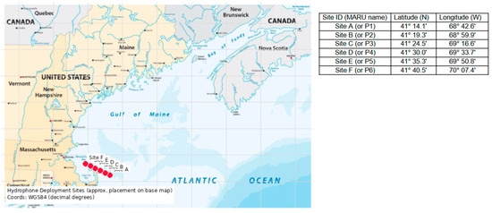 Geographic location of recording sites for the DCLDE NARW upcalls in the Gulf of Maine, off the coast of Massachusetts. The red circles indicate the precise locations of the Cornell University MARU hydrophone deployment sites (A–F). These recorders formed a fixed array used for data collection from 2000 to 2009. The precise coordinates (World Geodetic System of 1984 (WGS84)) for each site are listed in the adjacent table.