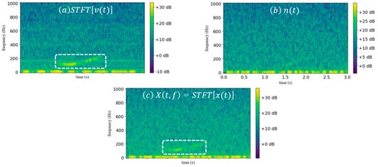 Time–frequency (spectrogram) representations of (a) v(t) as in the dashed white box; (b) noise n(t) as in Equation (3); and (c) as in the dashed white box (Equation (4)).