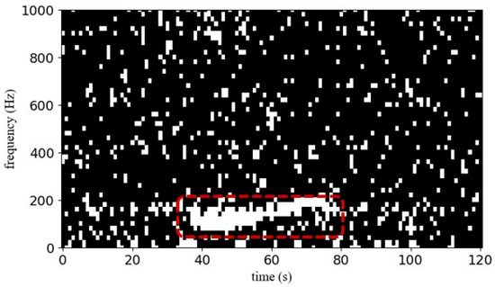 IBM applied to a superposed signal containing an upcall vocalization and background noise. The mask is created by comparing the energy of the target upcall signal to the energy of the noise in each time–frequency bin by assigning 0 to pixels below the signal threshold and 1 to those above the threshold. White pixels represent time–frequency bins where the upcall energy is higher than the noise is assigned, and black pixels represent bins where the noise energy is higher than the upcall.