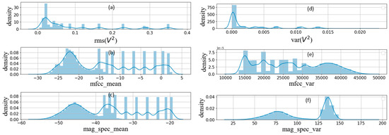 Example distributions (solid blue line) for 6 of the 20 extracted features (Table 4) across all curated upcalls (81,567): (a) energy_rms (); (b) mfcc_mean; (c) mag_spec_mean; (d) energy_var (); (e) mfcc_var; and (f) mag_spec_var. Features (a–e) exhibit right skew, while (f) shows a normal left-skewed distribution. Understanding these patterns allows for appropriate re-scaling to minimize skew and potential bias. Robust scaler normalization will be used.